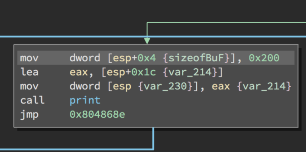 Seguidamente llamará a la función print() que se le pasará como argumentos el puntero del buffer y el tamaño del buffer. Vemos una nueva instrucción LEA moviendo la dirección de memoria y no el contenido de ESP+0x1c siendo nuestro puntero del Buffer en el STACK.