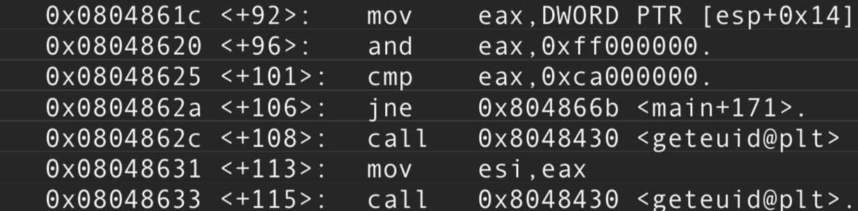 #include <stdlib.h> #include <unistd.h> #include <string.h> #include <stdio.h> #define e(); if(((unsigned int)ptr & 0xff000000)==0xca000000) { setresuid(geteuid(), geteuid(), geteuid()); execlp("/bin/sh", "sh", "-i", NULL); } void print(unsigned char *buf, int len) { int i; printf("[ "); for(i=0; i < len; i++) printf("%x ", buf[i]); printf(" ]\n"); } int main() { unsigned char buf[512]; unsigned char *ptr = buf + (sizeof(buf)/2); unsigned int x; while((x = getchar()) != EOF) { switch(x) { case '\n': print(buf, sizeof(buf)); continue; break; case '\\': ptr--; break; default: e(); if(ptr > buf + sizeof(buf)) continue; ptr++[0] = x; break; } } printf("All done\n"); }