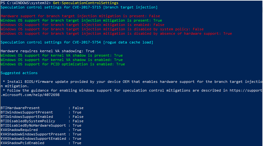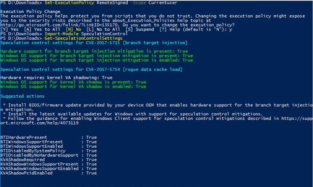 PS> Install-Module SpeculationControl PS> # Save the current execution policy so it can be reset PS> $SaveExecutionPolicy = Get-ExecutionPolicy PS> Set-ExecutionPolicy RemoteSigned -Scope Currentuser PS> Import-Module SpeculationControl PS> Get-SpeculationControlSettings PS> # Reset the execution policy to the original state PS> Set-ExecutionPolicy $SaveExecutionPolicy -Scope Currentuser