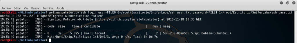 Una vez hecho, vamos a usar una herramienta distinta a las habituales para crackear ssh: patator (os dejo la tarea de ver todas sus funciones)