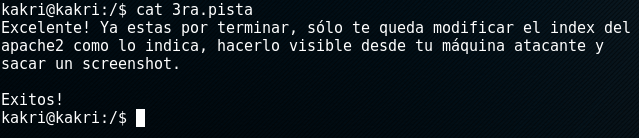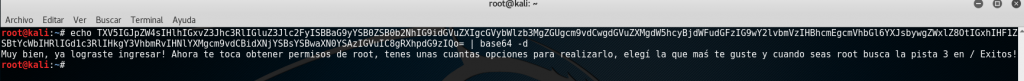 “¡Muy bien, ya lograste ingresar! Ahora te toca obtener permisos de root, tienes unas cuantas opciones para realizarlo, elegí la que más te guste y cuando seas root busca la pista 3 en / Exitos! “