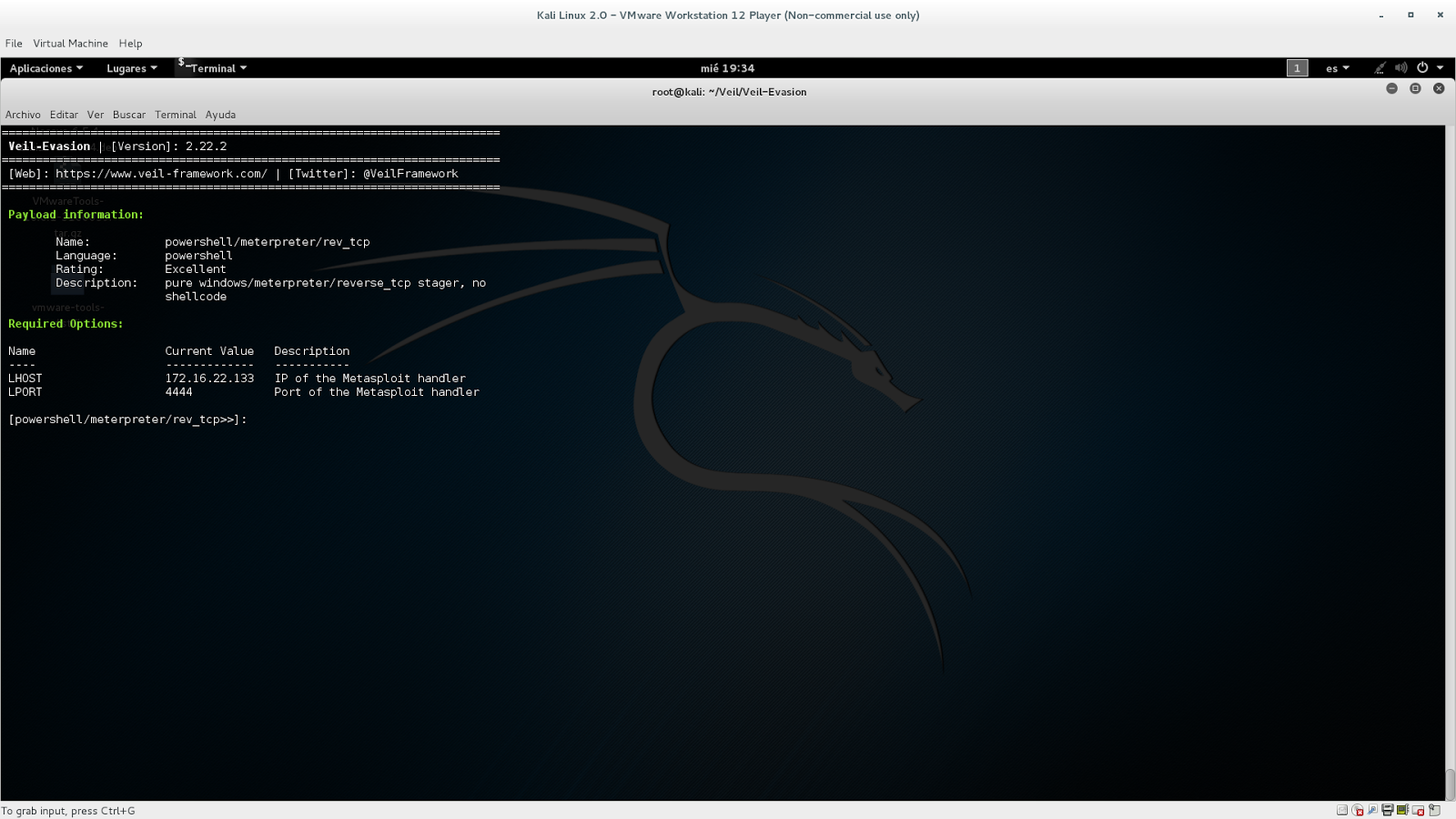Una vez instalado nos situamos en la carpeta Veil-Evasion y ejecutamos previamente dando los permisos necesarios para la ejecución. Existen 49 payloads. El comando a usar es ./Veil-Evasion.py.